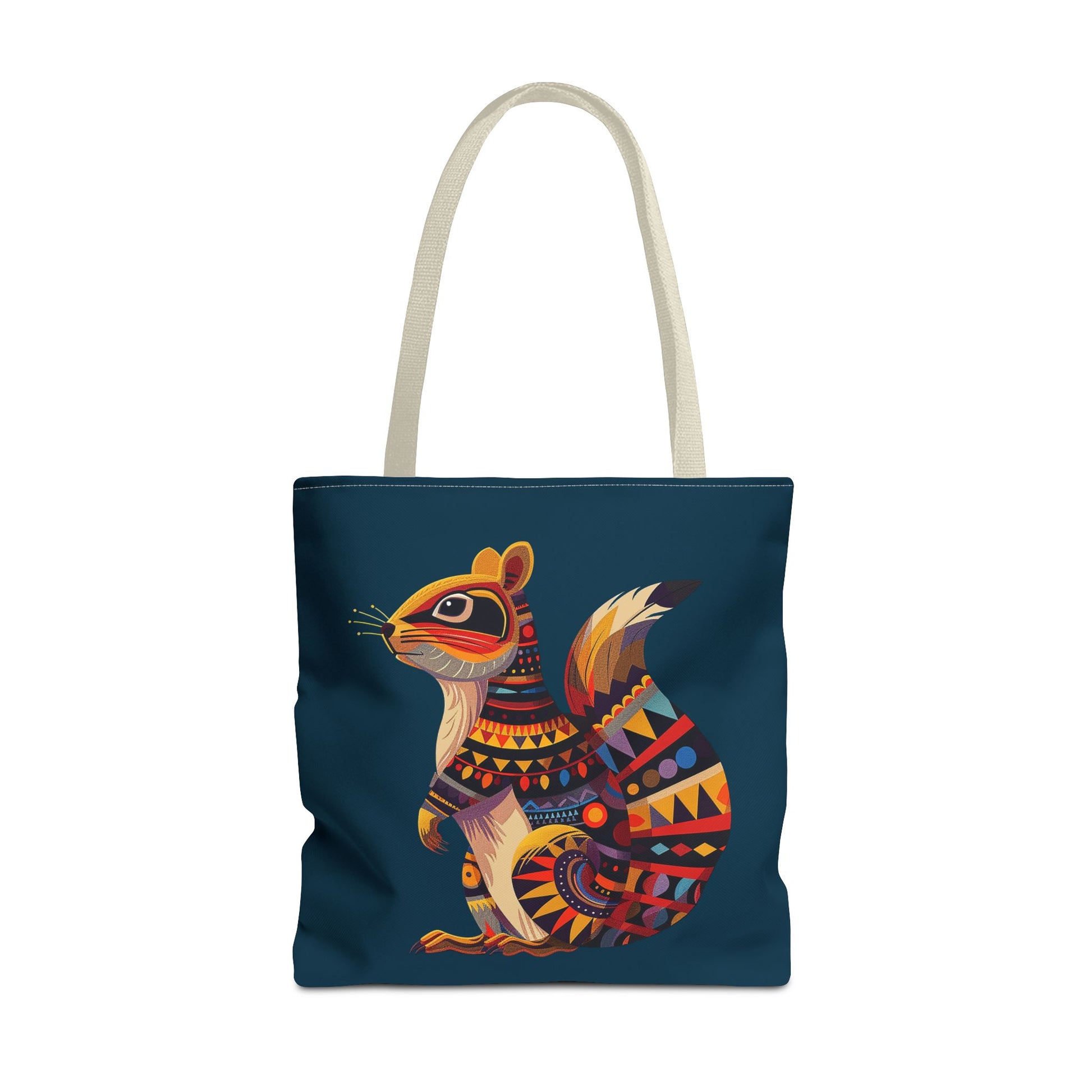 Embrace the charm of the forest with the Autumn Squirrel Tote Bag, a beautiful piece from our Spirit of the Wild Collection. This tote features a stunning illustration of a squirrel sitting proudly in profile, adorned with intricate, ethnic-inspired patterns that capture the magic of the woodland. The warm, earthy tones of the squirrel’s detailed design stand out beautifully against the very dark blue, almost black background, creating a striking contrast. Printed on both sides, this tote bag is perfect for nature lovers and those who appreciate artistic, whimsical designs. Whether you're out for a stroll or heading to the market, this bag brings a touch of forest charm to your daily adventures.